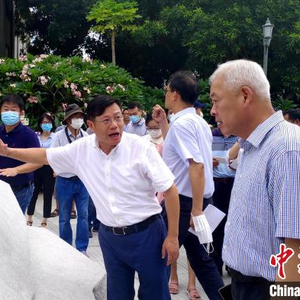 捐赠方、上市公司万里石董事长胡精沛(中)向厦门市人大常委会副主任叶重耕介绍相关建设情况。 杨伏山 摄