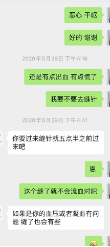 5月29日下午4时许,刘国帆再次发消息给滕医生,告知还是有点出血,询问是否要去缝针。对方回复:你要缝针就五点半前过来吧。