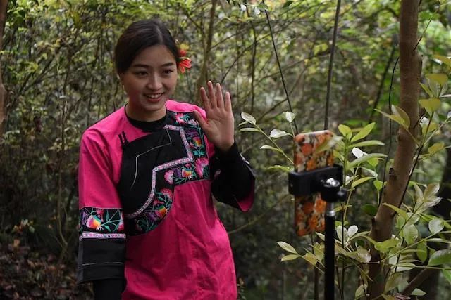 十八洞村里的苗乡“网红” 施林娇在直播中和观众打招呼(4月23日摄)。新华社记者 薛宇舸摄