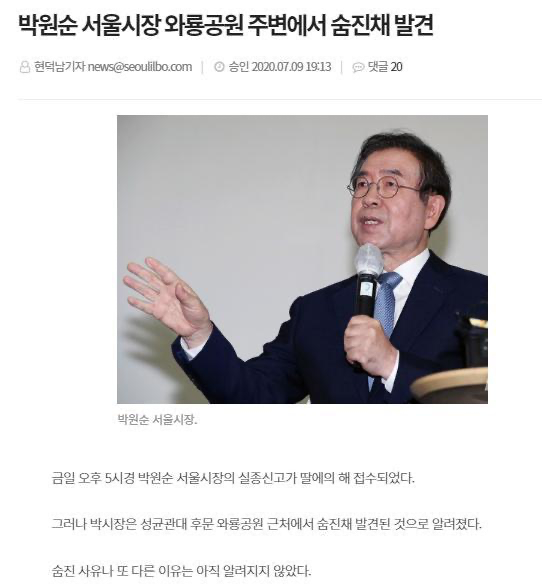 很快,这条新闻就被韩国警方证实为假消息。首尔地方警察厅有关人士表示,首尔市长朴元淳尸体被发现的传闻并非事实。 截至当地时间晚8时20分,朴市长仍然下落不明。