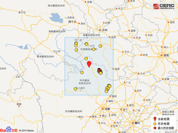 历史地震:根据中国地震台网速报目录,震中周边200公里内近5年来发生3级以上地震共84次,最大地震是2017年8月8日在四川阿坝州九寨沟县发生的7.0级地震(距离本次震中94公里),按震级大小前50次历史地震分布如图。