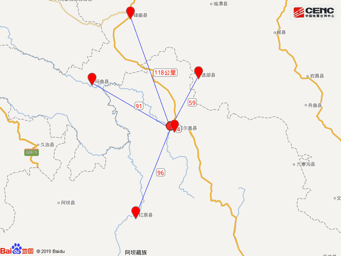 周边县城:震中距若尔盖县4公里、距甘肃迭部县59公里、距甘肃玛曲县91公里、距红原县96公里、距甘肃碌曲县118公里,距甘肃甘南藏族自治州155公里,距兰州市287公里。