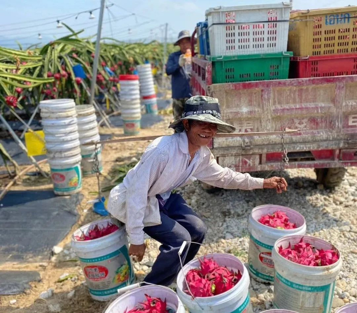 由于火龙果沾水易坏的特性,摘果都是选在中午,太阳把果面的露水蒸发,能更大限度降低损坏率。