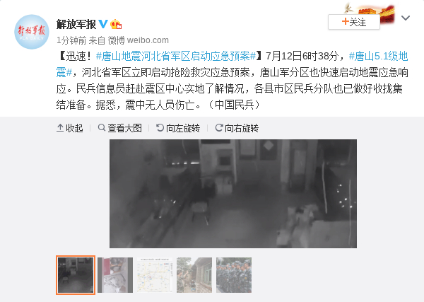 7月12日6时38分,#唐山5.1级地震#,河北省军区立即启动抢险救灾应急预案,唐山军分区也快速启动地震应急响应。民兵信息员赶赴震区中心实地了解情况,各县市区民兵分队也已做好收拢集结准备。据悉,震中无人员伤亡。(中国民兵)