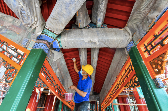 入行31年的梁师傅,昨天正在借秋楼内进行着油饰作业。“文物修缮没有太容易的事情,老祖宗留下来的‘一麻五灰’、十三道工序,一道都不能少。”梁师傅边拿着一个2公分的刷子边说。记者注意到,此次画中游建筑群修缮工程,不涉及彩绘部分,正式动工前,工人们先用薄膜将约350平方米的彩绘一丝不苟地“包裹”保护起来,待油饰施工进入到后期,再把薄膜取下来。“这就需要咱们干活更仔细,在油饰和彩绘的衔接部分做得更好,一点点慢慢刷,丝毫不能松懈。”
