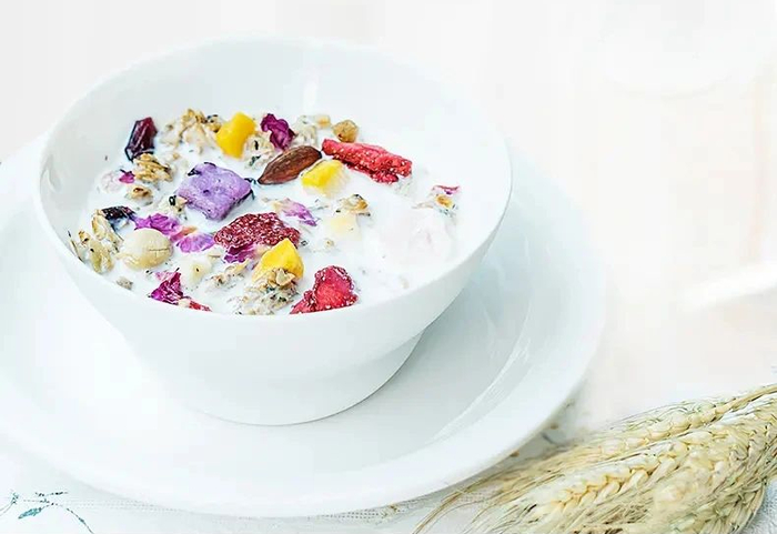 主料:燕麦脆,茉莉花茶+重瓣玫瑰,水果干,椰子片