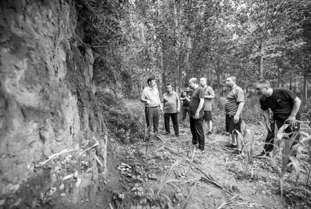 村里种植的玉米已超过一人多高,由于接连降雨,松软的地面泥泞难行。在南王庄村党支部书记兼村委会主任王进保、村党支部副书记巩书明的引导下,郭庭荣、王永忠等人在村西的一处上下均种满玉米的土崖处,看到了裸露在黄土层外的尸骨层。