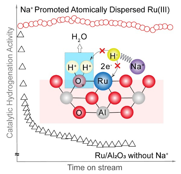 氧化物负载的金属纳米颗粒催化剂广泛应用于不同品种精细化学品(例如药物、染料、食品添加剂、香料等)的工业生产。金属纳米颗粒组分往往通过与氧化物载体之间形成较强的M+-O2-键确保金属颗粒高度分散度和稳定性。但在催化氢化过程中,分子H2可以在金属-氧化物载体界面通过异裂方式活化为氢化物(M+-Hδ-)和质子(O-Hδ+)。这些活泼氢物种除了参与催化底物的加氢外,还可以将界面处带正电荷的催化金属物种还原为零价金属,破坏金属-氧化物界面间的化学作用,并直接导致催化金属中心的团聚,催化性能下降。研究团队在合成Al2O3负载的单原子分散Ru催化剂(有Na+和没有Na+稳定的两种催化剂)的基础上,通过实验与理论计算的紧密结合,证明了Al2O3负载的单原子Ru催化中心附近的Na+离子在提升催化加氢性能中扮演着两种重要作用:(1)有效地阻止催化金属Ru(III)中心上活化氢化物向附近氧物种转移,防止单原子分散Ru(III)的还原团聚长大;(2)通过稳定带负电的加氢反应中间体和过渡态,提升单原子Ru(III)的催化加氢活性。系统研究表明,碱金属离子促进的Ru1/Al2O3催化剂对多种芳族和杂环底物的氢化具有很高的活性和稳定性,还存在独特的H/D反同位素效应。