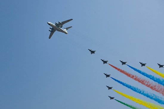 2019年10月1日上午,庆祝中华人民共和国成立70周年大会在北京天安门广场隆重举行。这是领队机梯队。新华社记者 刘金海/摄(资料图片)