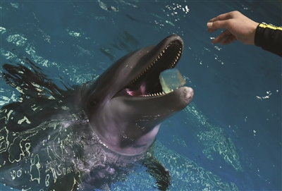 在饮食方面,工作人员根据动物体质和习性合理搭配了营养餐。“海豚适应的温度是22℃至25℃,当气温升高,为了给它们补充水分,我们会准备鱼肉果冻,每顿500克,一天喂两次。”饲养员介绍,海豚像其他海洋哺乳动物一样,从来不喝海水,它们通过食物获取水。为海豚特制的鱼肉果冻是用鱼胶粉和水做成的,清凉解暑,海豚明星“大卫”“丫丫”非常喜欢吃。