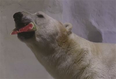 到了夏天,北极熊仔仔最爱甜甜的西瓜。饲养员将西瓜切片送到岸边,仔仔立马精神了,跑过来大快朵颐,先啃瓜瓤,接着把西瓜皮也吃得干干净净。