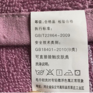毛巾属于和人体皮肤直接接触的B类纺织品,为确保毛巾质量,《纺织品纤维含量的标识》国家标准及毛巾的国家标准,对毛巾含棉量、脱毛率、色牢度、PH值等,都作出了详尽的规定。