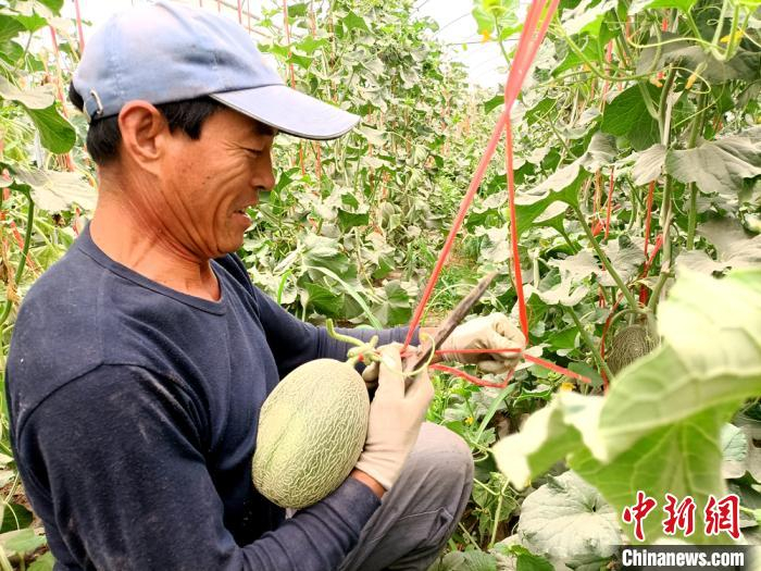 7月初,在大田蜜瓜还处于生长期时,瓜州县瓜州镇连体大棚的蜜瓜已陆续成熟上市。图为瓜农采摘蜜瓜。 王昭琪 摄