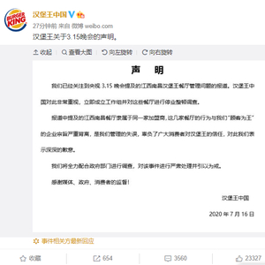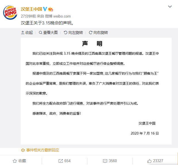 “汉堡王中国”官方微博回应称:已立即成立工作组并对相关餐厅进行停业整顿调查,报道中提及的江西南昌餐厅,与“顾客为王”的企业宗旨严重背离,辜负了广大消费者对汉堡王的信任,对此汉堡王表示深深的歉意,将全力配合政府部门进行调查,并对该事件进行严肃处理并引以为戒。