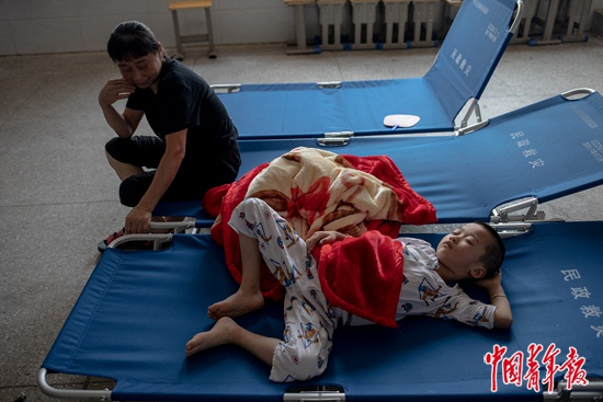 7月14日,江西省九江市永修县湖东学校安置点,李秋红和她的孙子。由于家中浸水严重,他们于13日下午来到这里。九江市修河三角联圩发生溃堤后,县湖东学校成为当地最大的安置点。中青报·中青网记者 李隽辉/摄