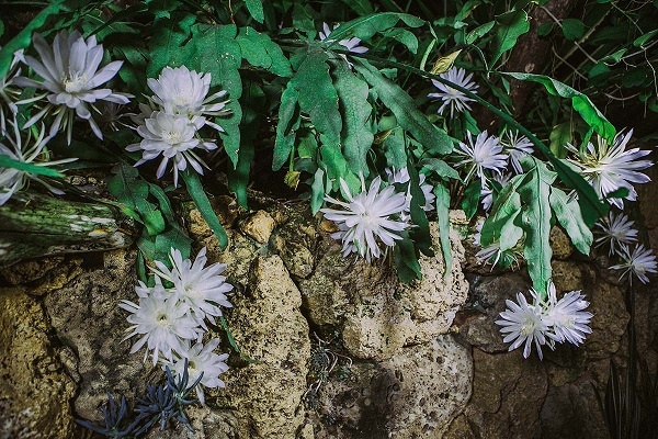 据辰山植物园的植物学博士郗旺介绍,这株昙花生长于沙生植物馆西南侧走道的石崖上。早在两周前,工作人员就已经观察到其叶状茎上发育出大量花芽。7月14日傍晚,大部分花苞已经露白,表明将于当夜开放。晚上8时许,已有花苞打开层叠的花瓣,露出花蕊。22时30分,昙花就已达到完全开放的状态。