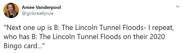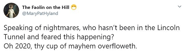 一名女网友说,她最害怕的事情是在她成长过程中林肯隧道崩塌导致自己溺死在车中,但她一直在内心告诉自己,这样的担心不合情理,不过今年可是2020年。