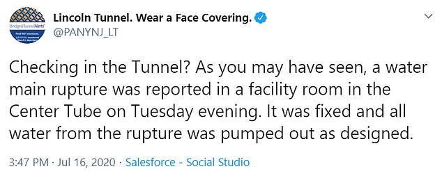 漏水事故导致车辆不得不缓慢行驶。纽约港务局接报后派人前往现场勘查。工作人员说,中间隧道中一个设备间的主水管发生了破裂,导致隧道积水,他们不得不对隧道里的左边车道进行了临时封闭,时间长达半个小时,以便进行排水和维修作业。