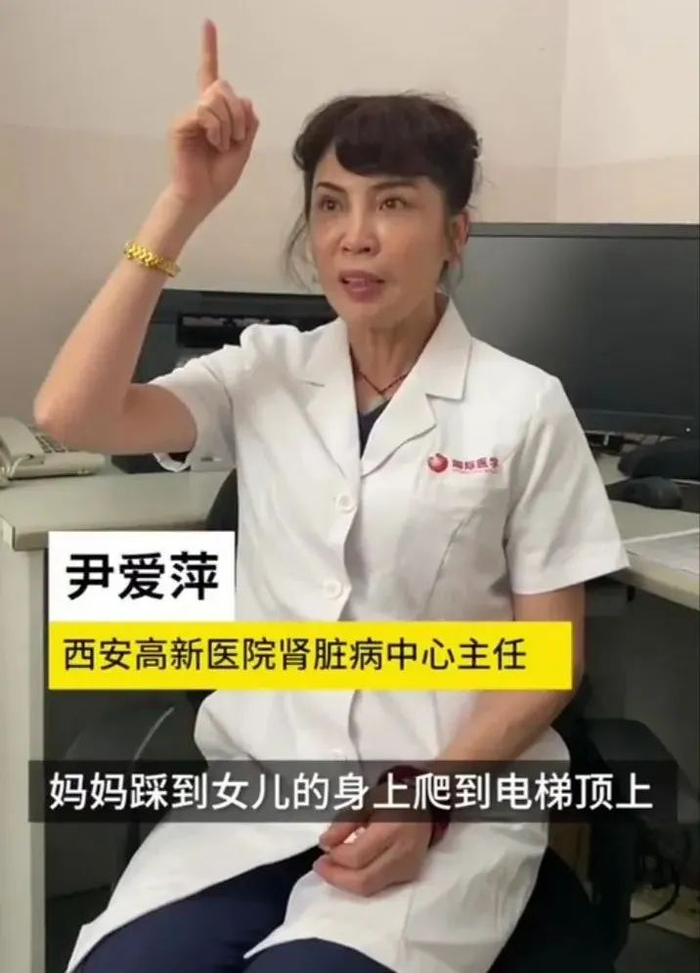 西安高新医院肾脏病中心主任尹爱萍:“妈妈踩到女儿的身上爬到电梯顶上,把电梯顶上的灯用拳头砸碎了。灯被砸碎以后,她把灯罩上的铁丝拿下来,就在电梯门口那用铁丝把电梯别开一个口后,两个人轮流到电梯口那里吸口气。”