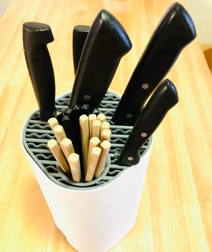 所以有人就问了,科技一直在进步,有没有一种简单方便、省事省力、干燥杀菌消毒兼顾的收纳盒,来替代传统木质刀架和筷筒呢?