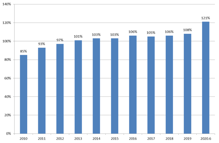 图3:2019年末主要经济体政府债务占GDP比例图