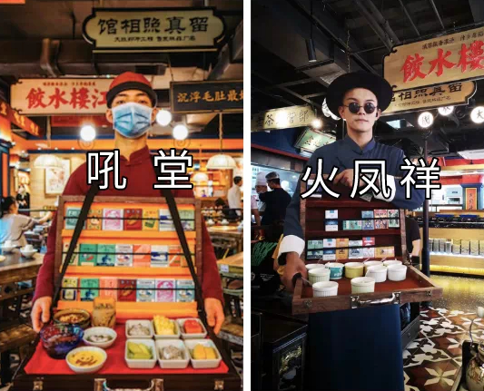 虽然18号才开业,但火凤祥此前已试营业,在大众点评上近30天内有78条评价。红星新闻记者从评价图片看到,整体装修风格与吼堂老火锅极为相似。火凤祥也采用红蓝色调,还原了上个世纪三四十年代的集市景象,店内同样设有小型菜市场,送餐口同样为市集档口,就连创意服务人员也是上个世纪卖烟人的角色扮演。而最相似的细节在于牌匾的设计,都有“江楼水饺”、“留真照相馆”、“信记果园”、“李记肉铺”,餐具也都采用木质方盒配上雕刻的店名。