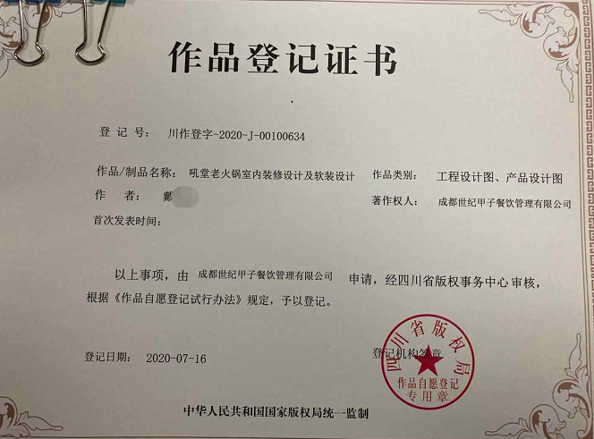 为保护整个团队为此付出的心血,袁先生此前申请了两份作品登记证书。登记号为川作登字-2020-F-00099770作品登记证书显示,吼堂老火锅平面及VI应用、产品设计的作者及著作权人,为成都世纪甲子餐饮管理有限公司。登记号为川作登字-2020-J-00100634作品登记书显示,吼堂老火锅室内装修设计及软装的设计作者为戴朝盛,著作权人为成都世纪甲子餐饮管理有限公司。两份申请均经四川省版权事务中心审核予以登记,登记日期为2020年7月16日。