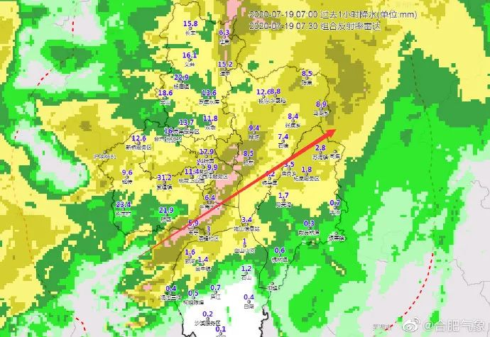 雨区还在继续并将如图箭头所指方向