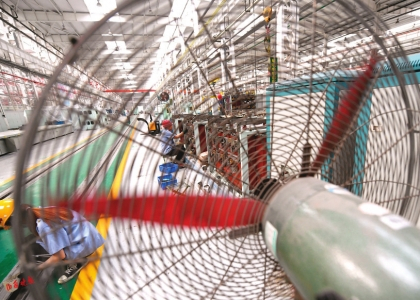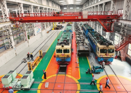 走进工作车间,眼前一派繁忙的景象。工人们拿着手电、手锤、电扳手……他们有的进行合作作业,有的钻在车体底部进行检修,还有的坐在高高的天车上操作……这里随处能听到“丁零咣啷”的声音。工作车间里每个工作区域划分细致、分工明确,山西晚报记者在工作人员的带领下参观了检修车库的部门检修工序和作业流程,参观结束后,记者已经满头大汗,行走步数达到了一万三千多步。“那不算啥,我们每天行走上万步很正常”,工作人员说道,“这个电力机车检修车间,总面积达2.7万平方米,员工490余人,车间分机车解体组装区、电器检修区等八大区域36个检修作业区,由于机车体积大、部件多,所以检修区空间必须足够大,这里配设的主要机械动力设备和辅助工装就有336台(套)。”