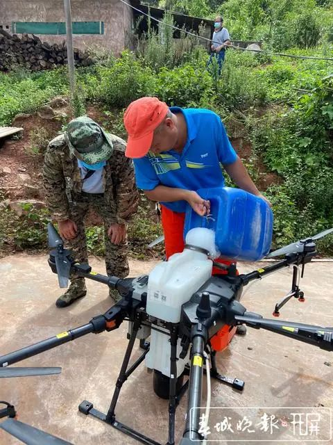 “村民领了以后,根据规定剂量和水配好后,对发现的蝗虫进行消杀。”该乡副乡长张德飞告诉开屏新闻,每包可以配三到四桶每桶20公斤的药水,当地植保部门采取无人机飞防蝗虫入侵。
