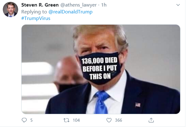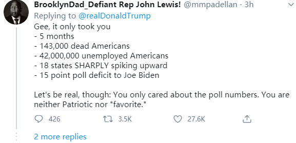 “在5个月里死了14.3万美国人,4200万美国人失业,18个州疫情暴增,15个民意调查都显示你落后拜登之后,你才说出了戴口罩这样的话。所以,现实点吧,你根本不是爱国,也不是人们最喜爱的总统,你只是关心选举数字”。