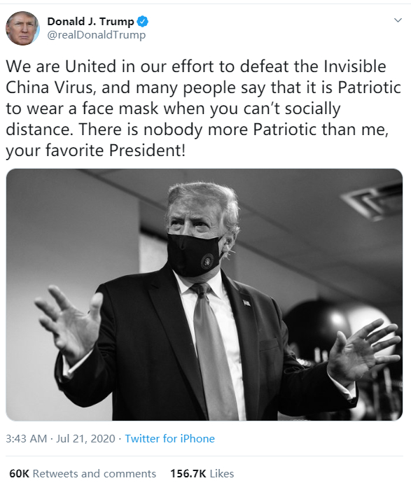 “我们正在团结一致打败隐形的中国病毒。很多人都说当你无法保持社交距离的时候,戴口罩是一种爱国的表现。作为你们最喜爱的总统,没有人比我更爱国。”