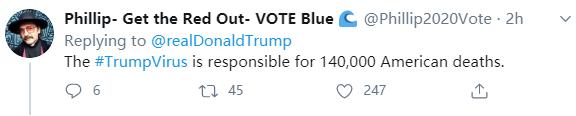 “这不是中国病毒,而是特朗普病毒。特朗普才是地球上迄今为止肆虐的最致命的病毒。而疫苗则是2020年11月3日的总统大选,届时人们将通过投票将他永远赶走”。