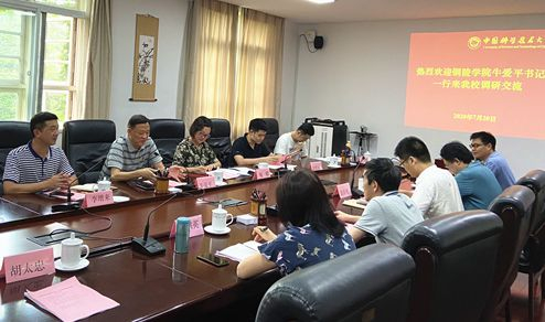 7月20日,铜陵学院党委委员、纪委书记牛爱平,金融学院院长刘珺、副院长李增来一行来我校调研,就经管类人才引进相关工作进行交流。我校副校长杨金龙和党委副书记、纪委书记毕金初先后会见了牛爱平一行,就加强铜陵学院与我校研究生院、管理学院、国际金融研究院等单位合作事宜进行了会谈。调研座谈交流会在218楼三楼会议室召开。我校研究生院副院长李思敏、研究生院培养办公室主任万洪英、国际金融研究院副院长翁清雄及管理学院相关师生参加会议。