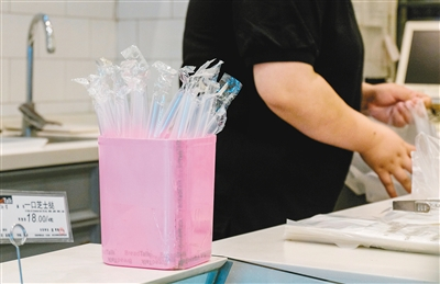 在位于友谊东路一家餐馆,除了冰箱里琳琅满目的啤酒、饮料,收银台上还有满满一盒塑料吸管。