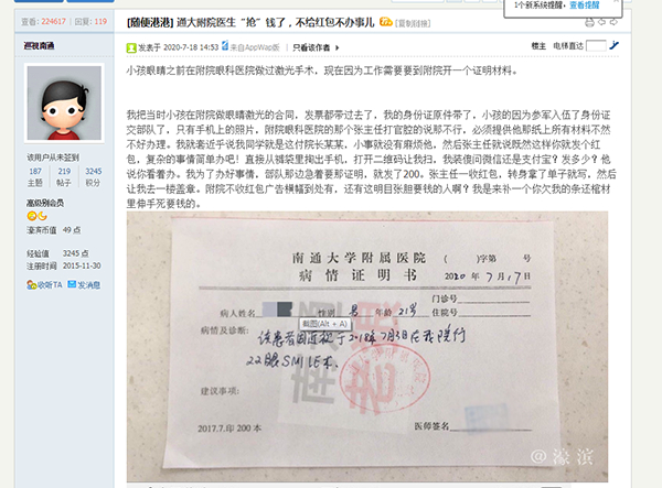 根据该网友帖子内容,因儿子工作需要,该网友于在7月17日中午,去南通大学附属医院开具儿子曾在该院治疗过眼睛的证明,但因没带身份证原件被该院眼科的一位姓张的“主任”拒绝。
