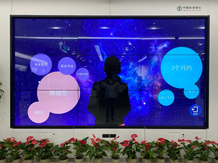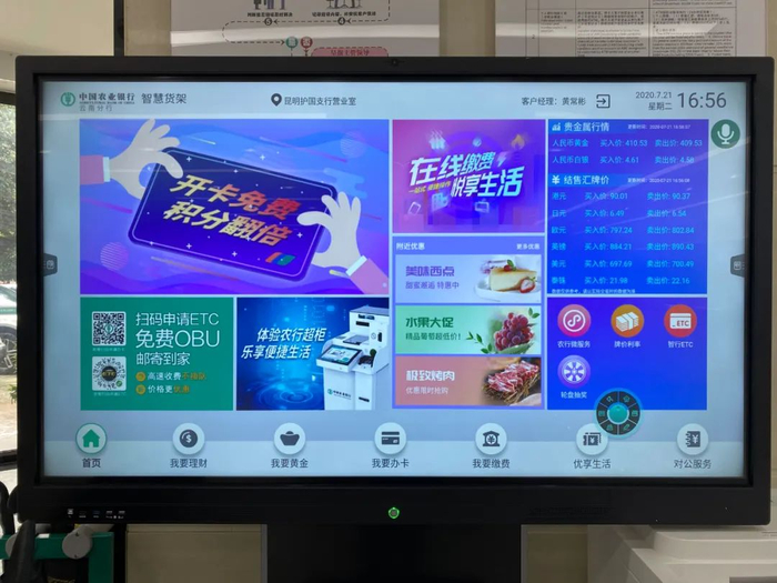在全省农行的630个网点营销服务区都摆放1台多媒体屏幕模拟“货架”,集中展示行内上3000多只理财产品、2000多只基金产品,周边商户生态圈以及网点金融场景的载体,使原有在网点“看不见”“摸不到”的产品和服务变为“可见、可听、可体验、可购买”的货品,打造网点“产品服务展示+人员主动营销+客户自助交易”的营销模式。在“货架”上,生活缴费、美食优惠、商超促销等应有尽有,支持一键扫码购买,一站式满足客户所有衣食住行金融需求。