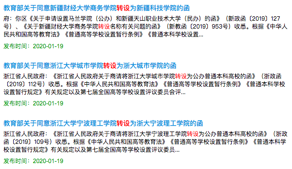 包括上述学校在内,中国青年报(ID:zqbcyol )了解到,今年教育部已发函同意多所高校的转设。具体如下: