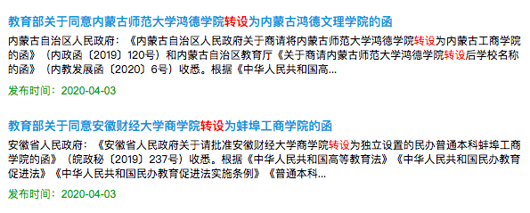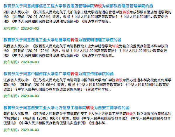 此前,教育部办公厅曾印发《关于加快推进独立学院转设工作的实施方案》的通知。到 2020 年末,各独立学院全部制定转设工作方案,同时推动一批独立学院实现转设。