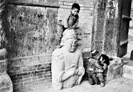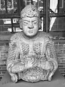 其中一张拍摄时间为昭和十五年(1940)十二月、标记为运城关帝庙门前石像的照片引起了笔者的注意,照片中关帝庙门前右侧放置一尊拱手武士半身石像,武士头顶有一小男孩手扶武士头盔站立在武士双肩之上,武士像与庙门墩间还有两个年纪更小的小孩在亲嘴,整个画面非常生动鲜活,想必当时的摄影师也是看到这样温馨的画面才按下相机的快门的吧。而这张80年前的照片带给我们的不仅仅是感动,还有对生命的敬重,如果照片中的那三位幼童还在世的话,都也已经是80多岁的老人了,生命无常,照片上的场景就是永恒。而那尊半截武士像头戴如意头盔,身着双肩兽头钉纹铠甲,双手拱揖,怒目圆睁又略显窘态,形象刻画生动、雕刻工艺精湛。时过境迁,运城关帝庙也于2013年3月5日被国务院公布为第七批全国重点文物保护单位,整个庙宇被修缮得庄严肃穆、清幽典雅,而那尊武士像已不在门口矗立,甚至我寻遍整个关帝庙也未曾找到。