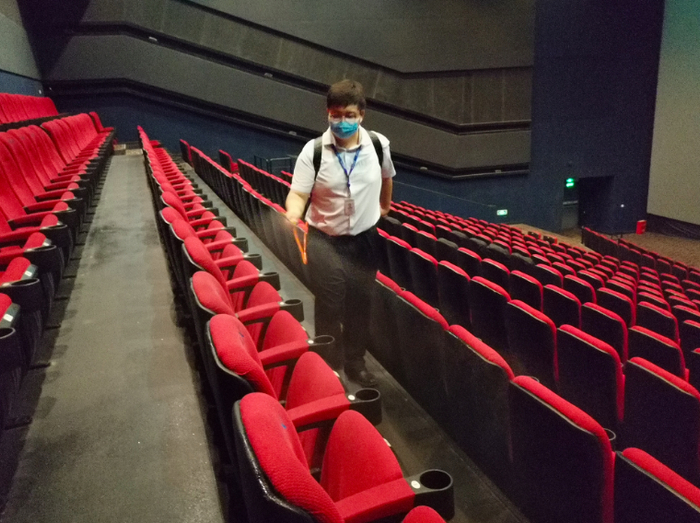 上午10点半,影厅工作人员背上消毒药箱走进影厅,对每一个角落仔细进行消杀。