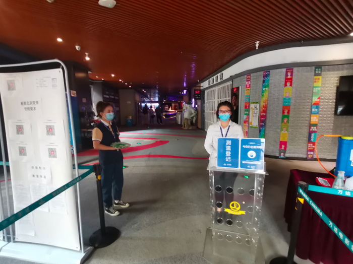 记者注意到,观影区与候影区除了验票闸机,又新增了防疫检票口。“消费者进入影厅之前,必须测温、出示健康宝绿码。”万达影城通州店经理硕帅说。除此以外,防疫检票口预备了免洗洗手液、一次性口罩等物资。