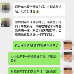 小林一一照办。然而客服发来截图,告诉小林他的任务超时,被系统锁定,需要重刷一遍才能解锁,否则无法返款。心急如焚的小林急忙又刷了一次四连单,此时,小林已经支付数万元。