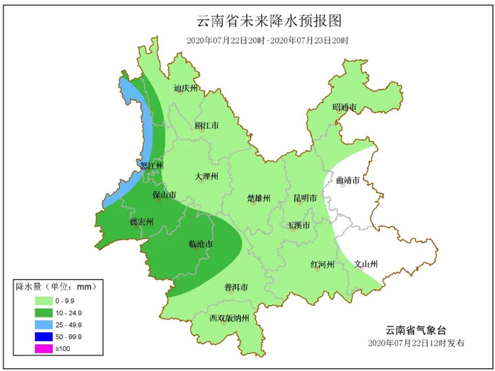 7月22日20时--7月23日20时:怒江西部、保山北部、德宏北部阴有中到大雨,怒江东部、保山南部、德宏南部、临沧、普洱北部多云间阴有小到中雨,其它地区多云局部有阵雨。