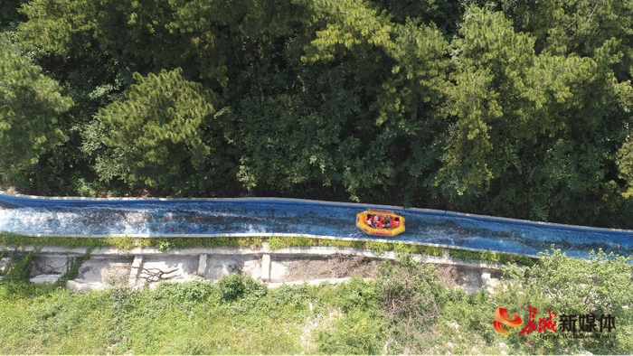 7月22日,游客在丰润区山缘生态庄园景区体验漂流。无人机照片