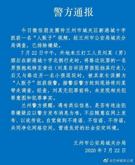 7月22日中午,一段“兰州市新港城现场抓住人贩子”的短视频在微信朋友圈转发。经警方初步调查,涉事男子系酒后和小孩玩闹,被群众和家长误解。