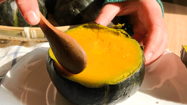 南瓜煮熟之后,用勺子轻轻一压就变成了泥。
