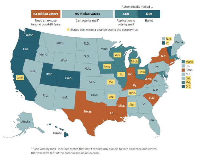 目前,全美34个州和首都华盛顿特区已经允许任何人无理由缺席现场投票,而其中许多州还在努力将邮寄投票的过程简易化,许多州将向每一个登记选民发送选票缺席申请,科罗拉多州选举机构已经表示将开始积极主动地向登记选民开展选票邮寄工作,加州也指出该州将紧跟科罗拉多州的步伐。