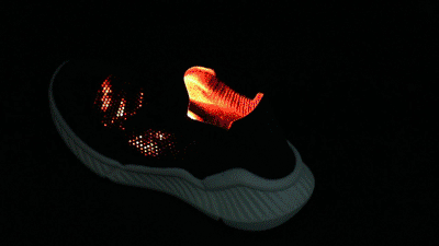 而这轻盈舒适的脚感要得益于这双鞋的鞋面,它是用高弹飞织纱线织成的袜套状鞋面。