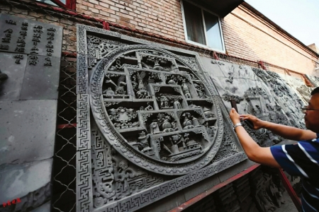 作为晋派砖雕及砖雕穿拓技艺的第八代传承人,温建明从上世纪90年代开始系统研究并实践传统晋派砖雕制作技艺。2008年成立晋砖世家传统文化艺术有限公司,2010年,创立晋派砖雕研究所,侧重挖掘、抢救、收集、整理、保护、传承和发展传统晋派砖雕艺术。温建明说:“我重建砖雕公司并不是以盈利为目的,一切都是为了两个字‘传承’,我想把祖辈留下的这门砖雕手艺发扬光大。保留原汁原味的同时也要开拓创新,在自己认可的范围内把品质做到最好,而不是追求利益最大化。”